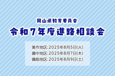 イベント(相談会・合同説明会) 岡山県教育委員会【令和7年度進路相談会】2025.07.22令和7年度進路相談会 岡山県教育委員会では、中学校・高校等で欠席が多い生徒や高校を中途退学した方、また、その保護者の方などを対象に、高校の関係者や進路相談員等が、個別に進路についての相談や情報提供等を行う進路相談会を開き...